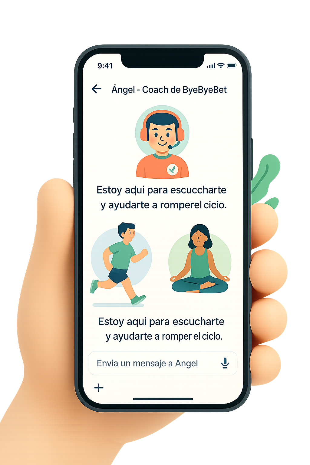 Ángel es tu asistente digital durante el programa de ByeByeBet. Está aquí para acompañarte, resolver dudas y apoyarte con claridad y empatía mientras das pasos para dejar las apuestas.